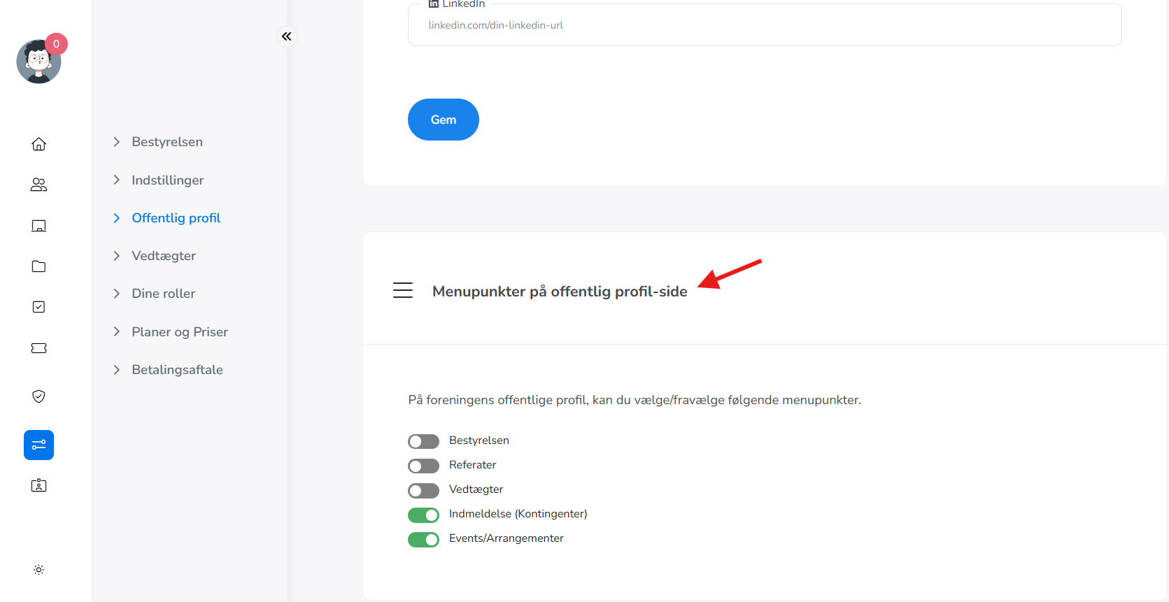 For at tjekke dette skal I gå til Indstillinger i Unioo og herefter åbne jeres offentlige profil, som vises i venstre side. Scroll helt ned i bunden af siden, hvor I kan slå menupunkter til eller fra.